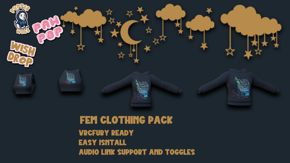 Drag and drop the provided prefabs or materials onto your avatar's clothing in Unity — then upload. VRCFury is used for toggles and customization, making setup quick and intuitive.